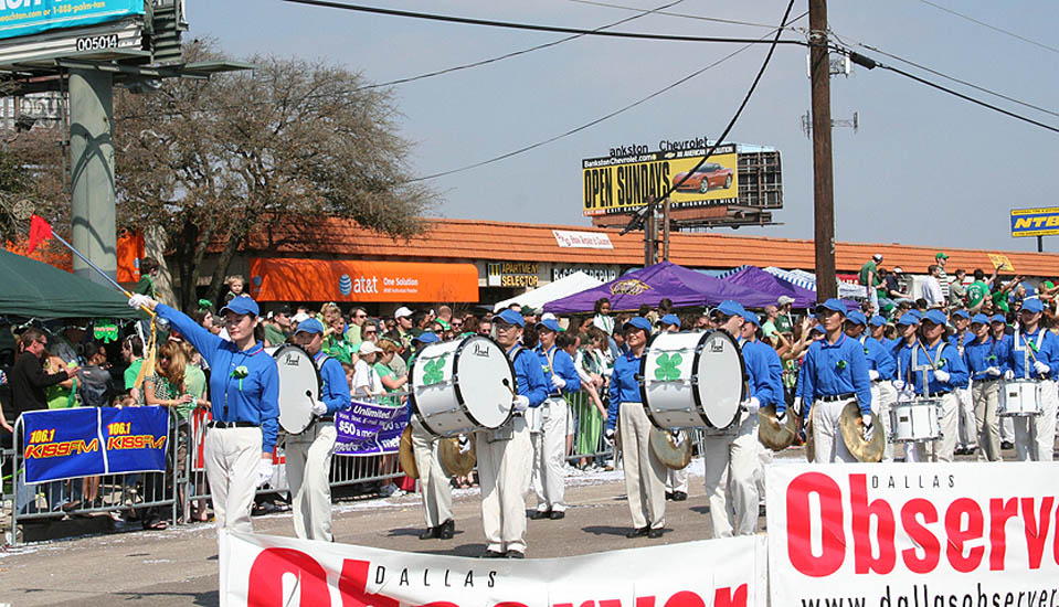 在达拉斯市格林维尔大道上圣派翠克日大游行起源于一九七九年,今年已是第二十九届。每年来观看游行的现场观众都是几万人,今年由于另一个在达拉斯市闹市区的圣派翠克日游行取消,使得来格林维尔大道上观看游行的人数激增,可望达十万人。十五日的游行在早上十一点开始,从Park Ln一直沿着格林维尔大道向南到Yale大道结束,约有两英里多的路程。