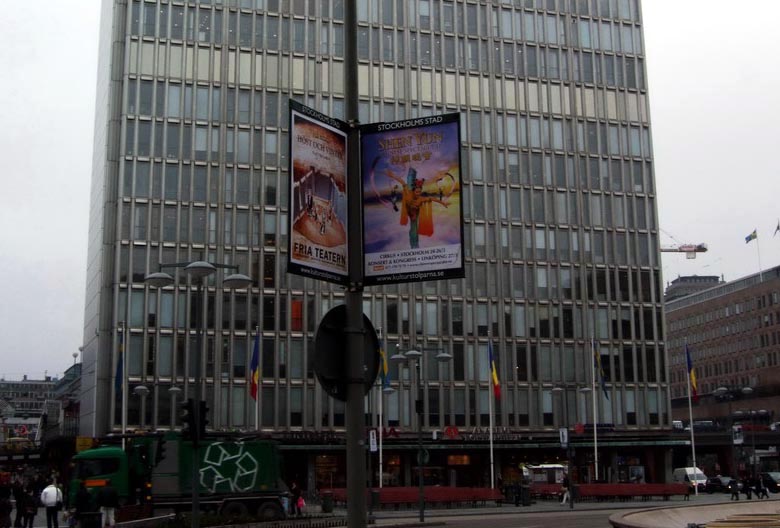 ![]() 在斯德哥尔摩市中心处处可见“神韵晚会”宣传广告牌。 |