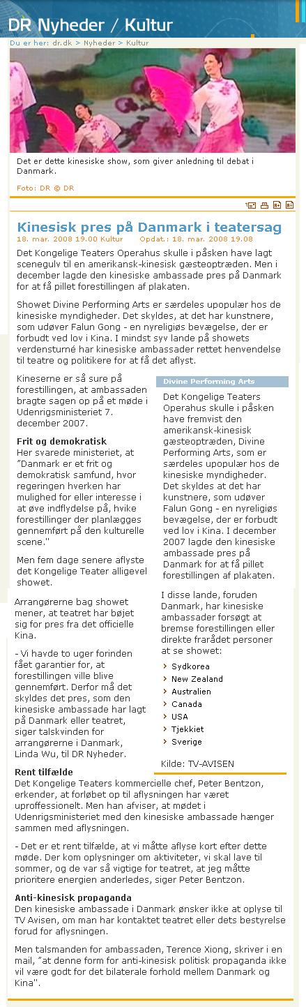 丹麦电视台在这则新闻中还说道,丹麦并非唯一遭受中共压力的国家,中共使馆还在韩国、新西兰、澳大利亚、加拿大、美国、捷克斯洛伐克、瑞典等国尝试破坏演出的正常进行,或是直接威胁观众不要去看晚会。