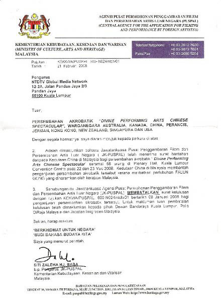 ![]() 马来西亚神韵晚会主办方收到文化部的通知,清楚写明准证被撤销的原因 |