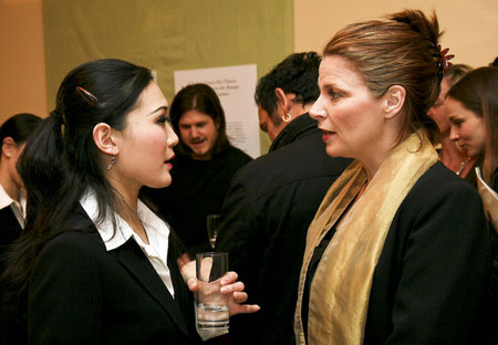 ![]() 瑞典著名歌剧演唱家Charlotta Huldt-Ramberg(右)与神韵巡回艺术团成员畅谈。 |