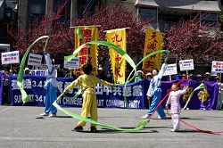 集会后,与会者们举行了游行;游行队伍穿过中国城的主要街道,吸引了不少路人的瞩目;他们有的争相拍照,有的询问详情,并有的在拿到揭露中共迫害人权的真相资料后,迫不及待马上阅读;还有华人上前对着队伍说:“你们做的很好;是越做越好。”