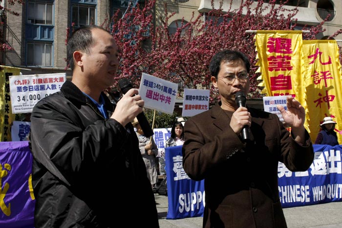![]() 集会发言人、北加州退党中心旧金山代表曾文彪和湾区电脑工程师张新宇。 |