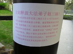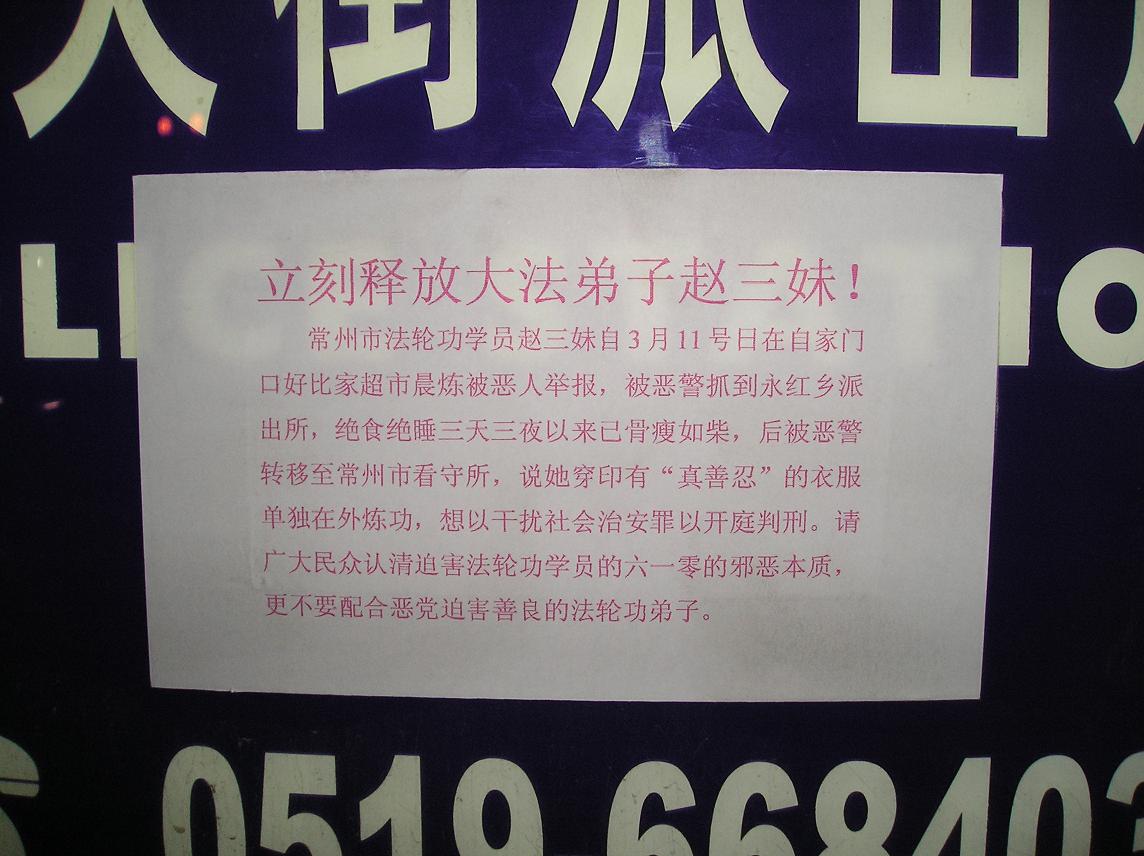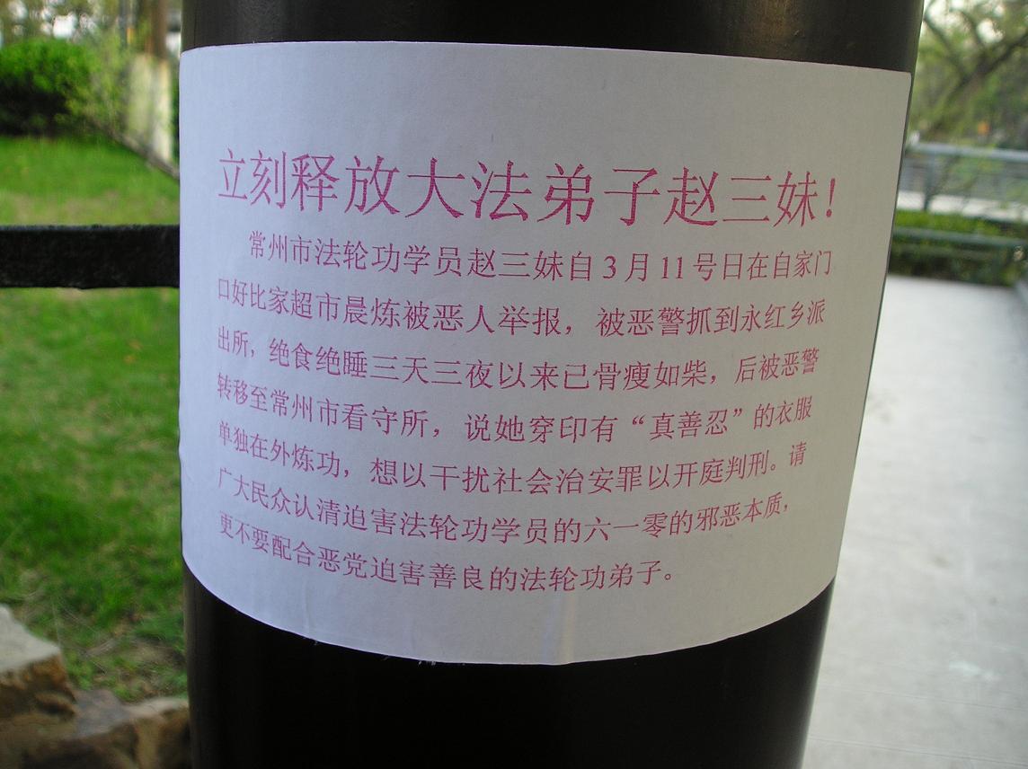 当地法轮功学员针对此一绑架事件,展开营救活动,曝光迫害真相。上图为法轮功学员在常州市公园、报刊栏、派出所附近张贴揭露迫害事件的真相传单。