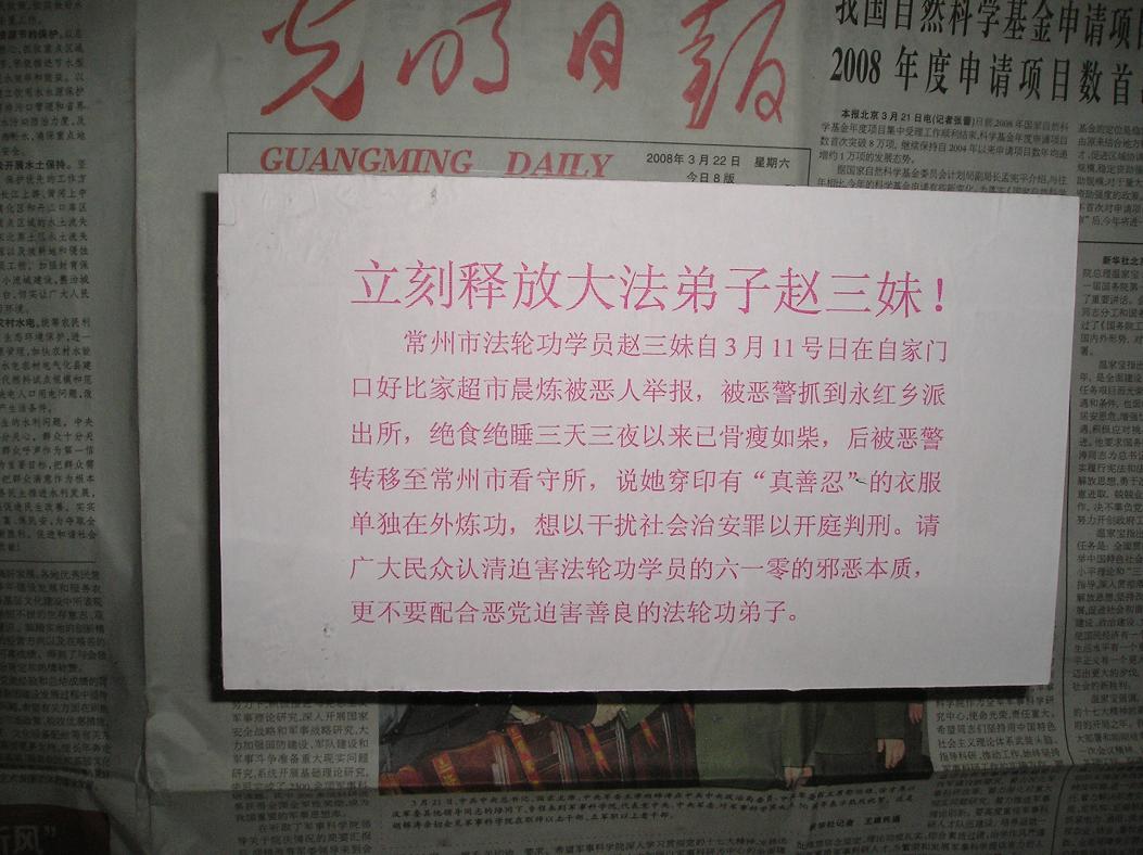 ,后被转关到常州市看守所。据悉,警察以赵三妹穿有“真善忍”字样的衣服在外炼功为借口,欲对她非法判刑。