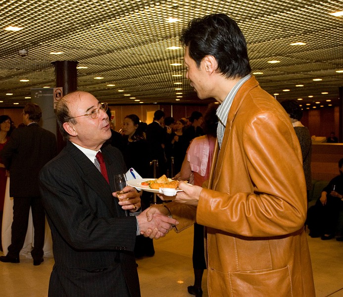 ![]() 晚会结束后,当Claude Micale(左)看到舞蹈《精忠报国》中岳飞的扮演者王学军(右)时,他兴奋的向王学军表达了自己对王学军舞蹈的喜爱之情。 |