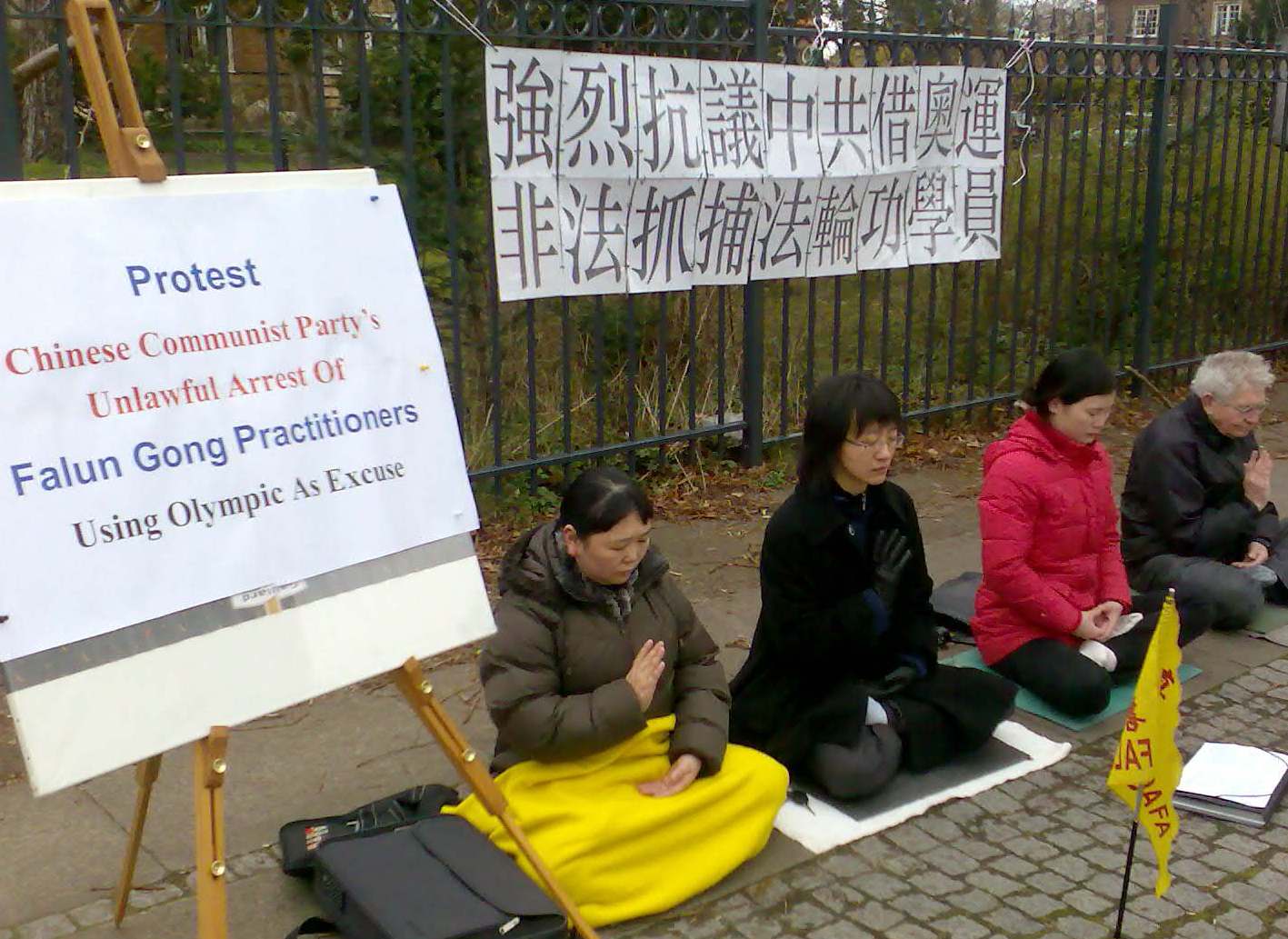二零零八年四月八日星期二上午十点,丹麦法轮功学员在哥本哈根中共驻丹麦使馆前集会,对近期中共当局以奥运为名升级迫害法轮功学员提出强烈抗议,同时呼吁丹麦各界认清中共邪恶本质,支持正义,呼吁丹麦社会共同制止中共对人权的践踏和对法轮功的迫害。