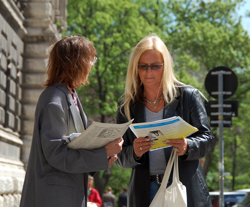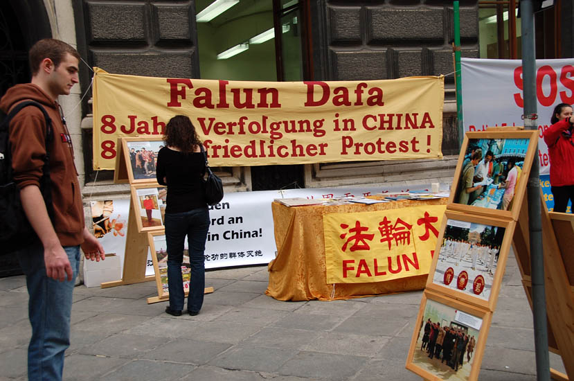 ![]() 奥地利维也纳市政厅门外,法轮功学员以展板、真相资料、功法演示等方式传播真相 |