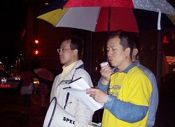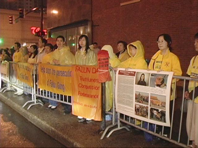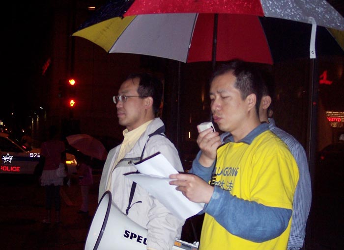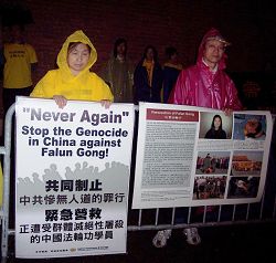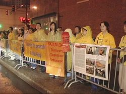 中领馆前的集会上,学员们打出了“抗议中共利用奥运掩盖群体迫害法轮功学员的罪恶”,“世界需要真善忍”的巨大横幅,学员代表在发言中表达了铿锵有力的声音:要求中共立即停止迫害法轮功,立即释放所有被非法关押的法轮功学员。奥运会与反人类罪不能同时进行,在奥运前,中共必须停止迫害法轮功。