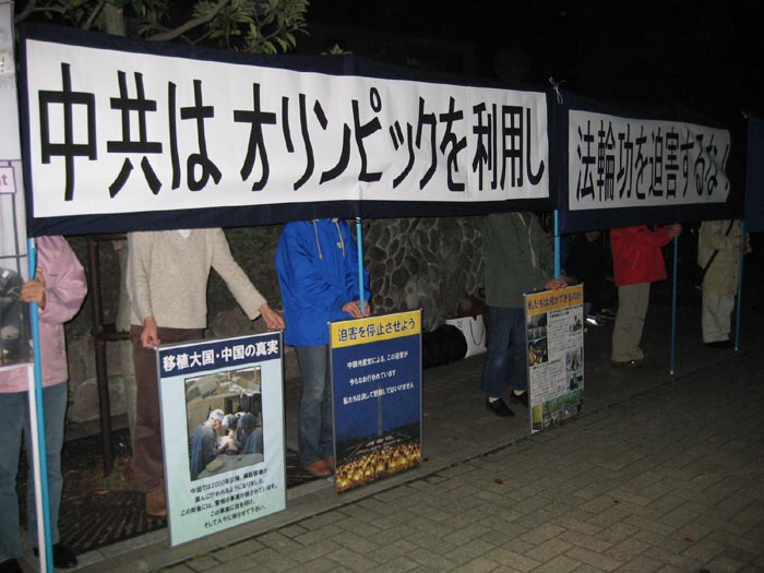 “法轮大法好!”“立即停止对法轮功的迫害!”“中共邪党停止借奥运之名,疯狂的迫害法轮功!”等横幅吸引了很多车辆和行人的注目。