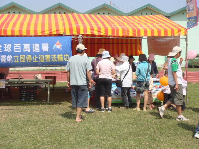 虽然会场上音乐声很大,但学员们不停的告诉现场的民众中共的邪恶真面目,请大家签名支持反迫害。善良纯朴的澎湖人纷纷签下了自己的名字,两天签名的民众约一千八百人,地方官员四十三人以上。