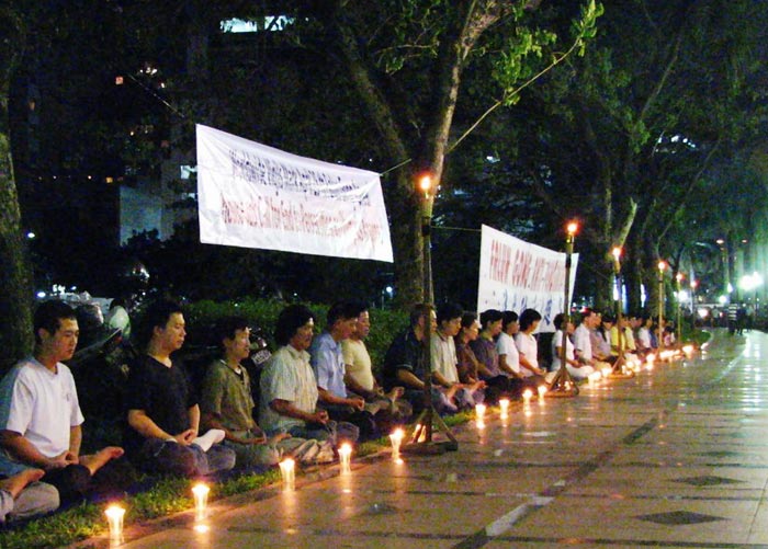 今天,印尼法轮功学员来到中使馆前,拉开横幅,举行烛光纪念活动,就是向世人表明法轮功反对迫害意愿。