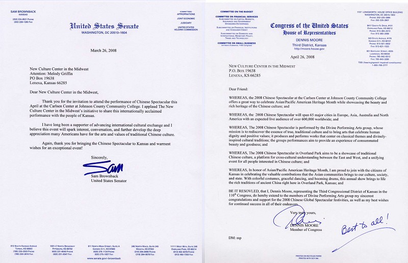 联邦众议员Dennis Moore也寄来贺信,对神韵的演出团队表达诚挚的支持与祝贺,希望神韵全球性的壮观演出能持续成功。