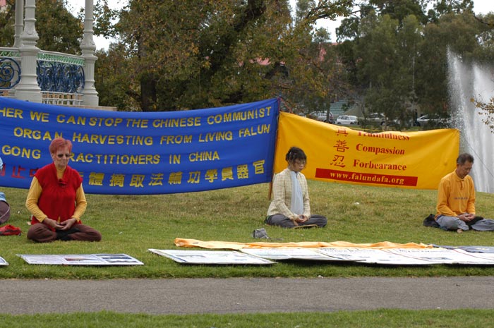 今天大家又都来到了市中心Elder Park向更多的人们讲述“法轮大法好!”学员们在优美的炼功音乐中展示功法及法轮大法洪传世界的图片、及中共对法轮功学员的非法迫害关押以及活体摘取法轮功学员器官,牟取暴利的罪行的横幅和图片。