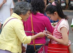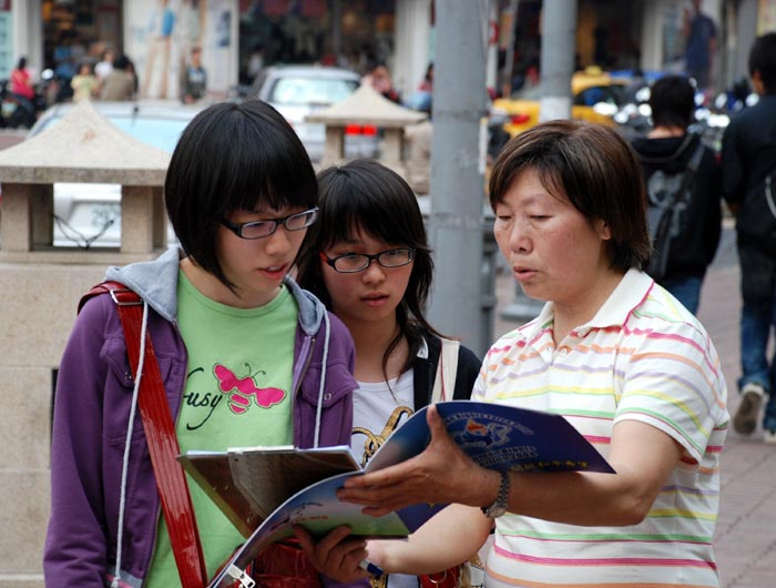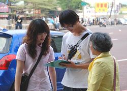 法轮功学员递上全球反迫害的真相小册子及征签板,请人们支持正义。学员详细的解说,人们认真的聆听,很快的就拿起笔签下自己的名字。