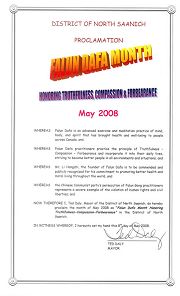 因此,我,泰•达利(Ted Daly),萨尼奇北部地区市长,在此宣布二零零八年五月为萨尼奇北部地区“法轮大法真、善、忍月”