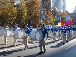 游行的第一方阵由天国乐团打头阵,鼓乐雄壮有力,震撼人心,展现了法轮功学员的铮铮骨气和顽强的生命力。