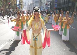 《转法轮》模型书、和身着金色服装的学员功法演示,和“法轮大法洪传世界八十多个国家”的横幅,花车、仙女队向世人展现着大法的美好。走在前面的是手持“法轮大法好”横幅、“真善忍”花匾的法轮功学员。中间的花车莲花座上端坐一位佛扮相的法轮功学员,庄严而神圣。随后而来的唐装舞、扇子舞、“琵琶舞”、清朝舞、舞姿曼妙,美丽缤纷,展示着中国传统文化的底蕴。法轮功腰鼓队精神抖擞,鼓槌翻飞喜洋洋,鼓声驱散了层层阴霾,观众也被其磅礴的士气所感染。