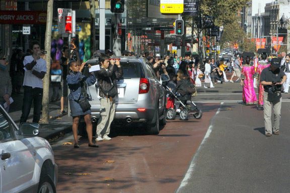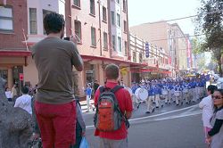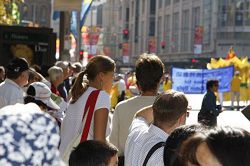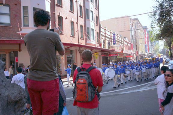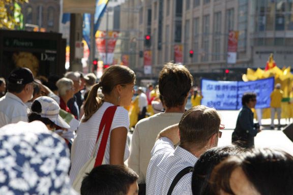 上午十一点钟,游行队伍浩浩荡荡的从悉尼市政厅广场向中国城出发。游行队伍分成三大部份,第一方阵展现法轮大法的美好,第二方阵反迫害,第三方阵是九评、退党。游行从悉尼市政厅开始,沿着市中心最繁华的乔治大街,经过唐人街到达悉尼娱乐中心。游行队伍中有男女老少以及不同族裔的法轮功修炼者,吸引众多民众观看,特别是来自大陆的华人和游客,纷纷拿起相机将这历史的珍贵瞬间保存下来。也有不少华人在主动索要真相资料,并询问哪里可以学功。