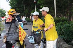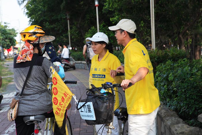 一位旗津路人接过传单了解真相后说:“我被你们的活动震撼了,非常吸引人。我觉的法轮功是个有益的功法。社会需要这种能够舒解烦躁压力的运动来平衡生活。中共不应该迫害这么美好的功法。”