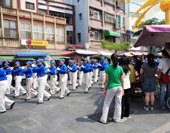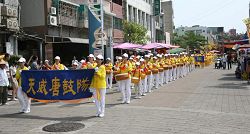 游行结束后各组学员会合,由法轮功学员天国乐团表演了“法轮大法好”,代表所有台湾南区的法轮功学员表达对法轮功创始人李洪志师父的感恩之心。