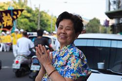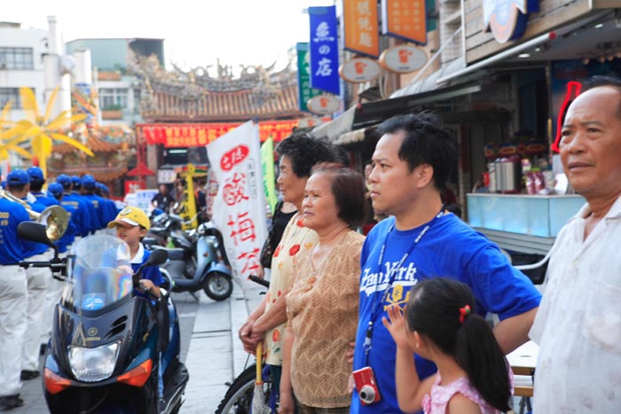 游行队伍从旗津渡船场出发,途经旗津闹区,最后抵达旗津区公所水舞广场。队伍由手持“法轮大法好”横幅的天国乐团引领,接着仙女队、乾坤鼓队、天威唐鼓队、最后由腰鼓队压轴组成,向世人展现着大法的美好。天国乐团响彻云霄的乐音,沿途吸引人潮夹道围观,很多路人鼓掌说“法轮大法好”,有的人还主动向“仙女”索取莲花和真相材料。