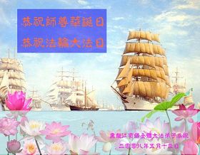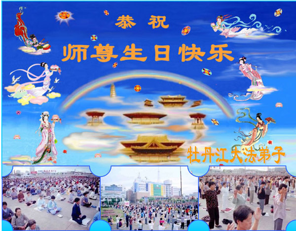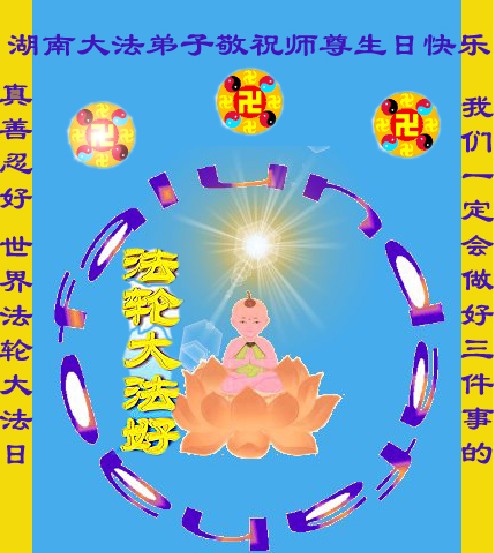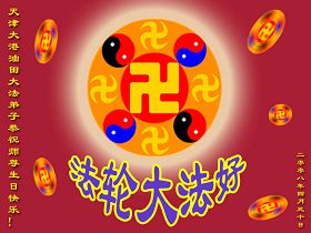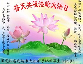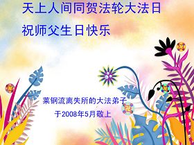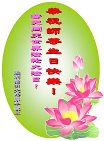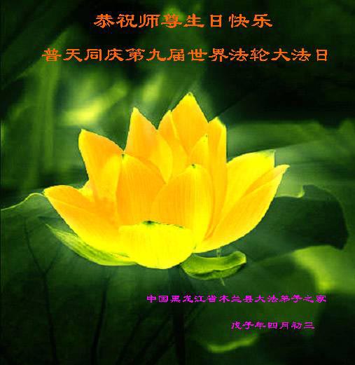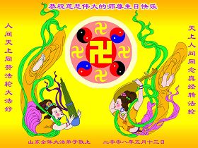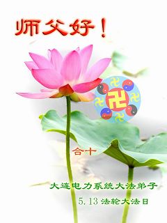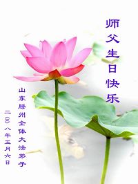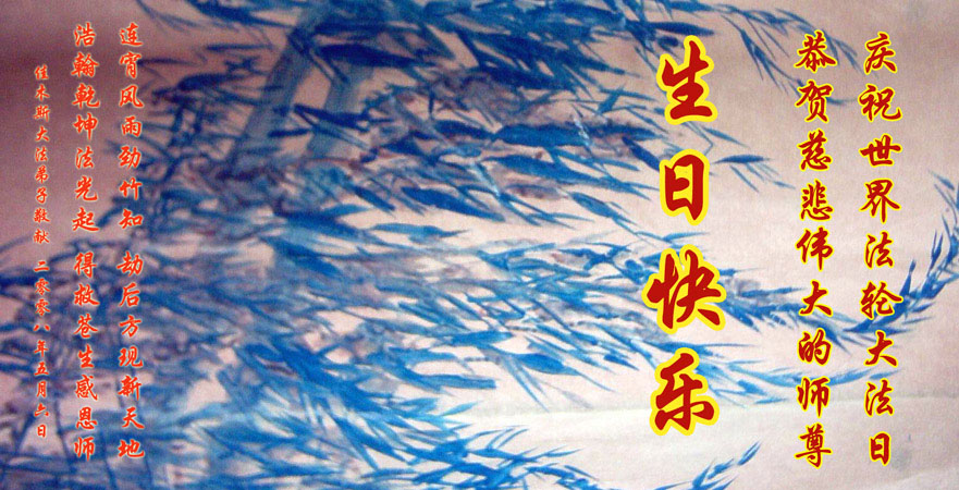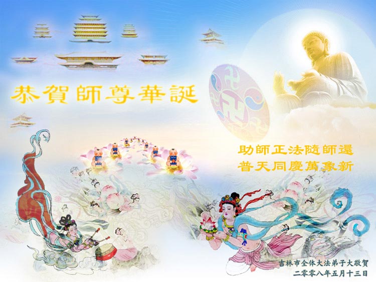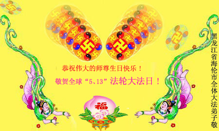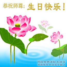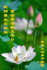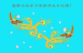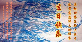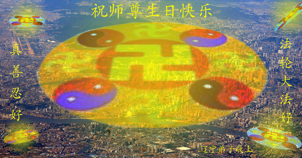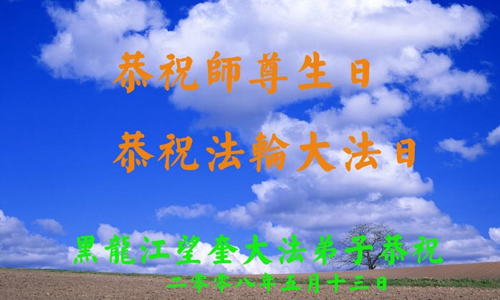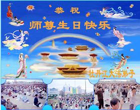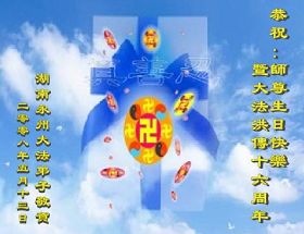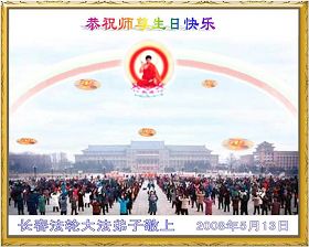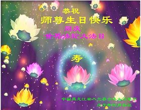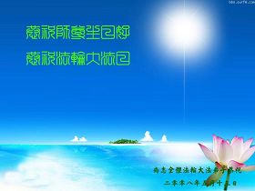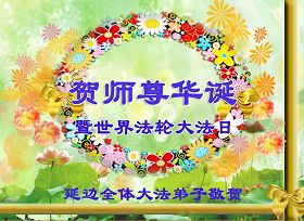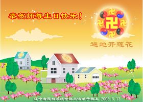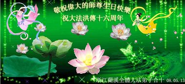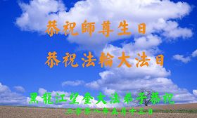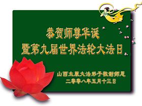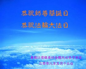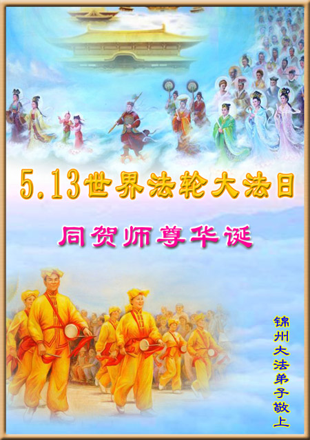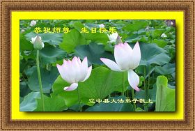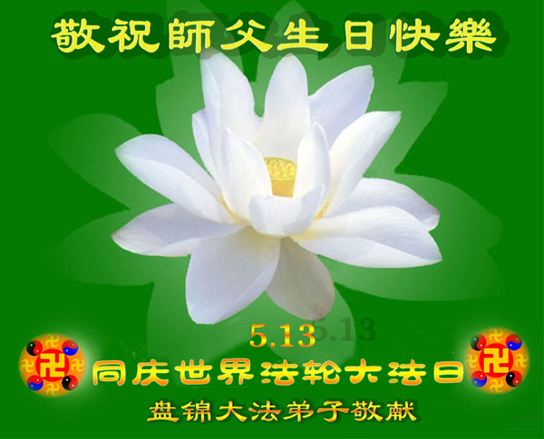 祝贺法轮大法洪传十六周年!祝贺第九届世界法轮大法日!在这双喜的日子里,首先恭祝慈悲伟大的师尊生日快乐!祝全世界大法弟子节日快乐!在此感谢师尊的慈悲苦度,我们盘锦大法弟子一定谨遵师诲,做好三件事,敬请师尊放心。愿全世界大法弟子共同精進!