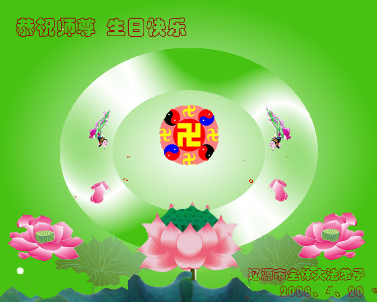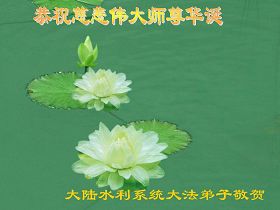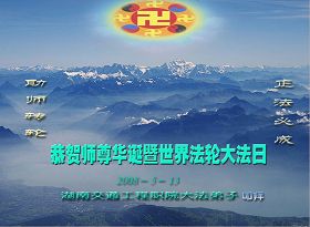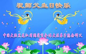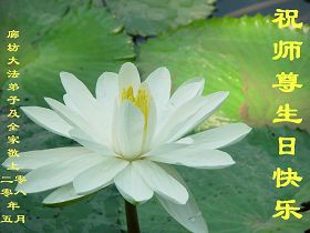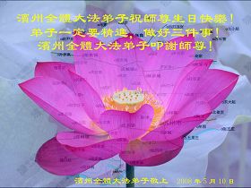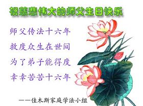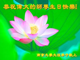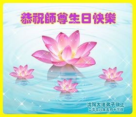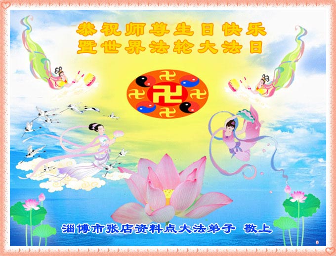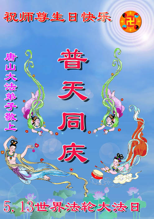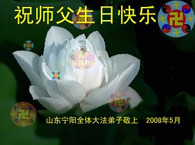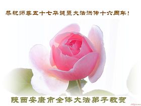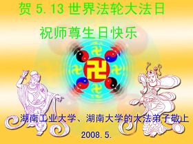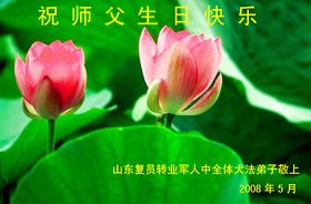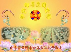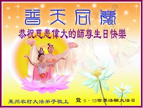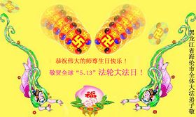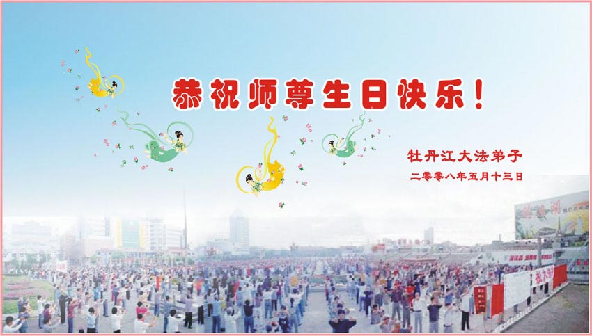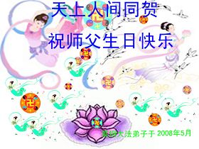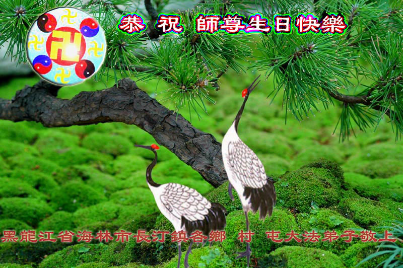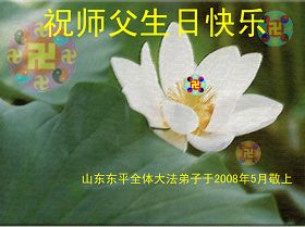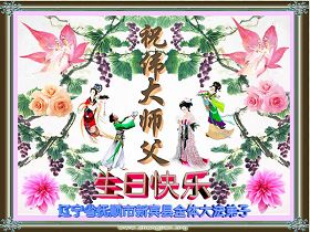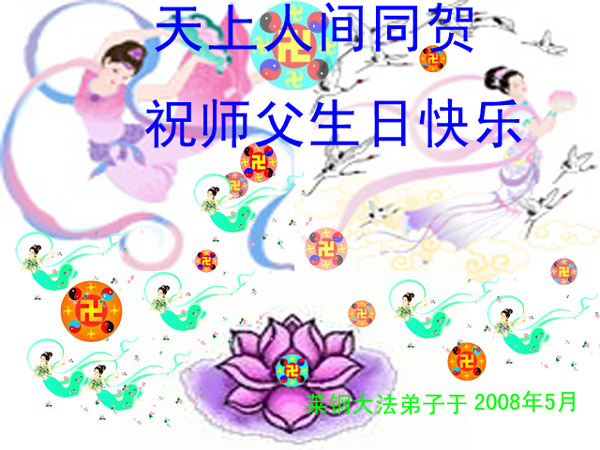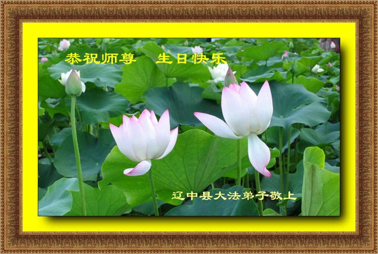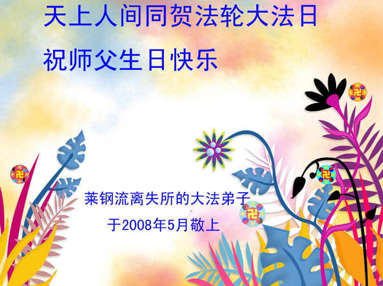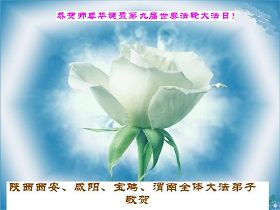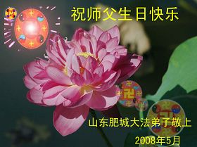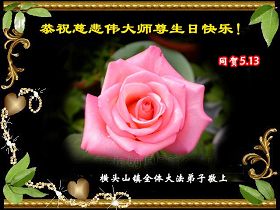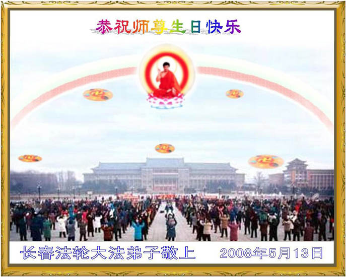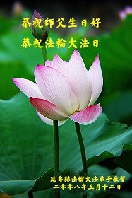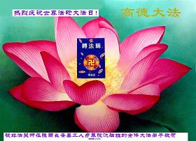 祝贺法轮大法洪传十六周年!祝贺第九届世界法轮大法日!在这双喜的日子里,首先恭祝慈悲伟大的师尊生日快乐!祝全世界大法弟子节日快乐!在此感谢师尊的慈悲苦度,我们盘锦大法弟子一定谨遵师诲,做好三件事,敬请师尊放心。愿全世界大法弟子共同精進!
