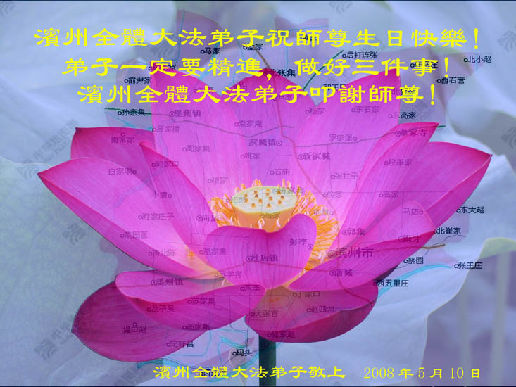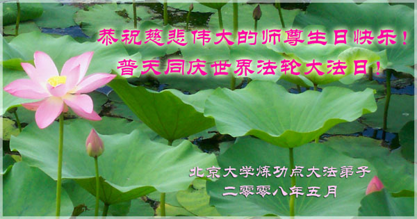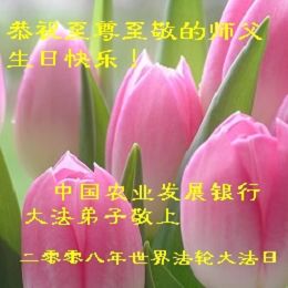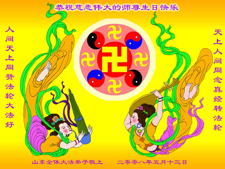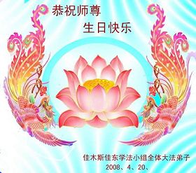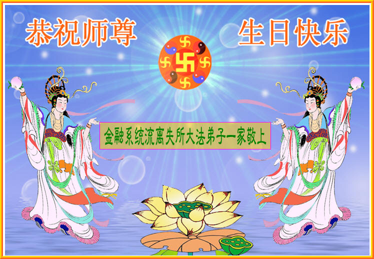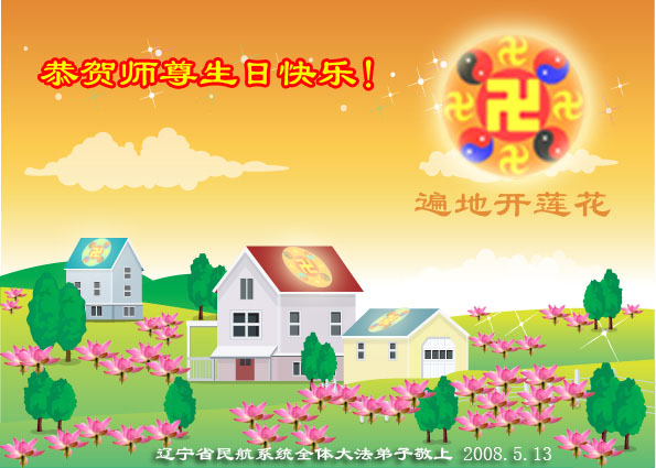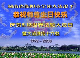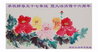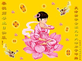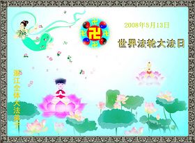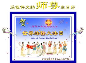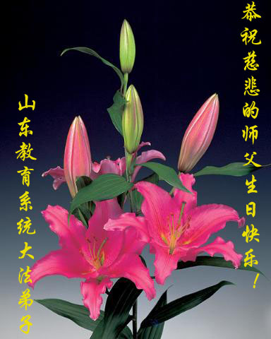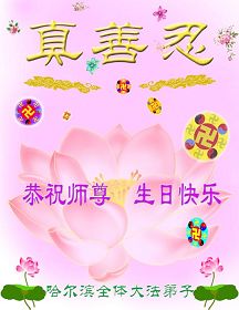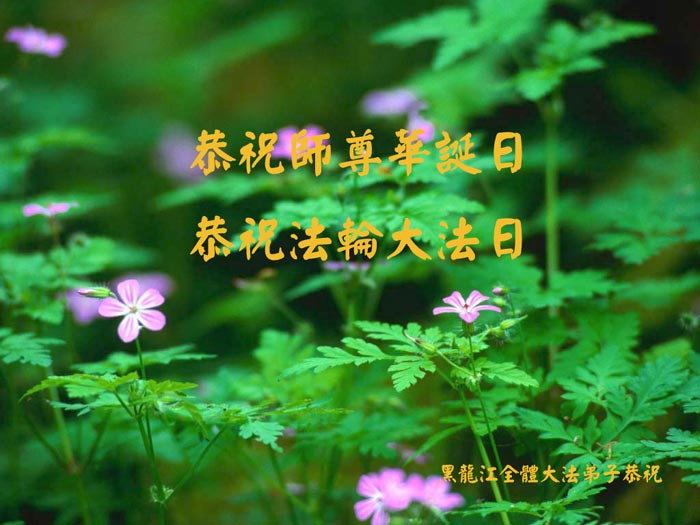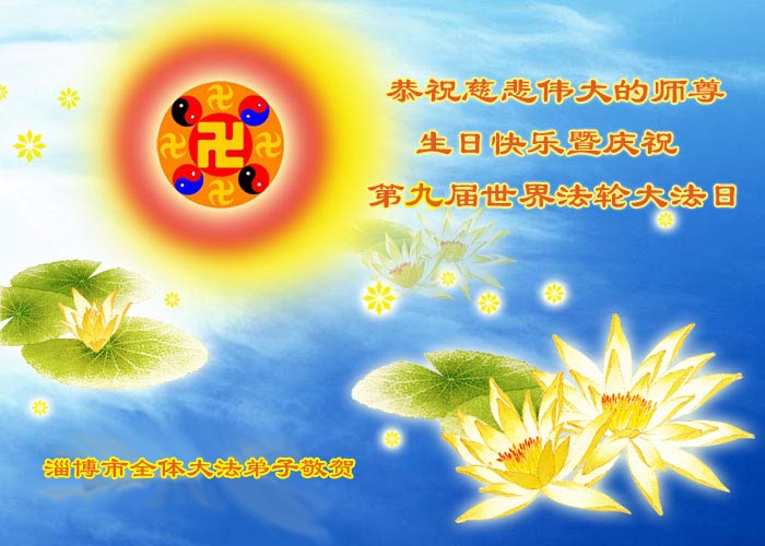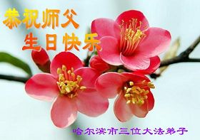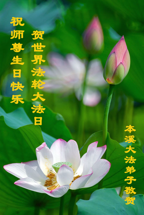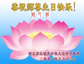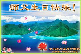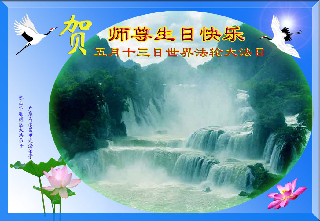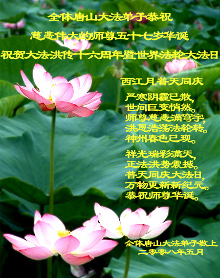祝贺法轮大法洪传十六周年!祝贺第九届世界法轮大法日!在这双喜的日子里,首先恭祝慈悲伟大的师尊生日快乐!祝全世界大法弟子节日快乐!在此感谢师尊的慈悲苦度,我们盘锦大法弟子一定谨遵师诲,做好三件事,敬请师尊放心。愿全世界大法弟子共同精進!