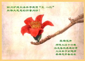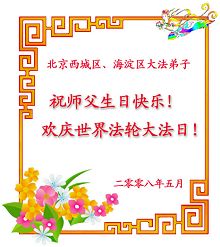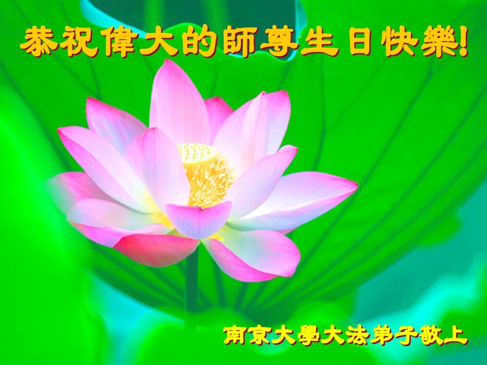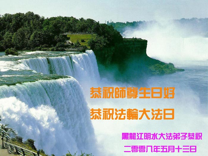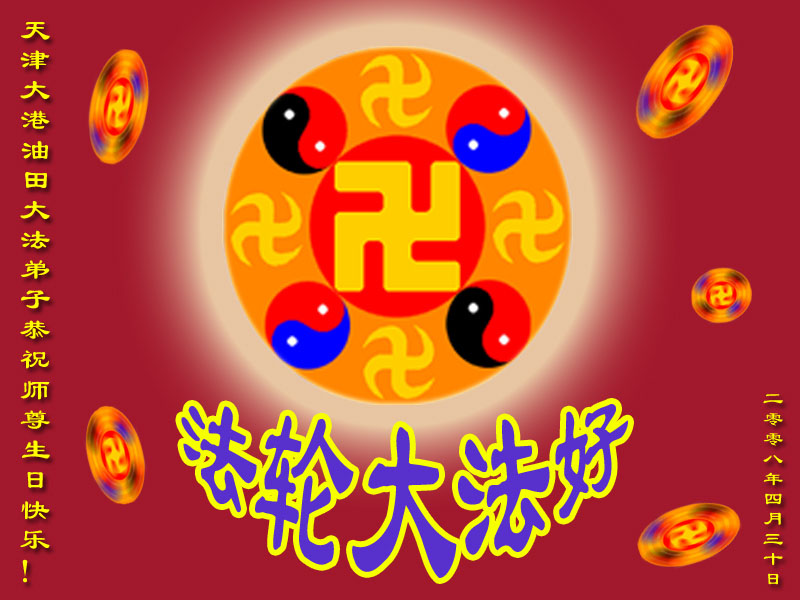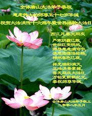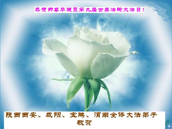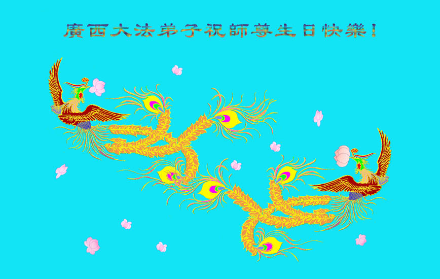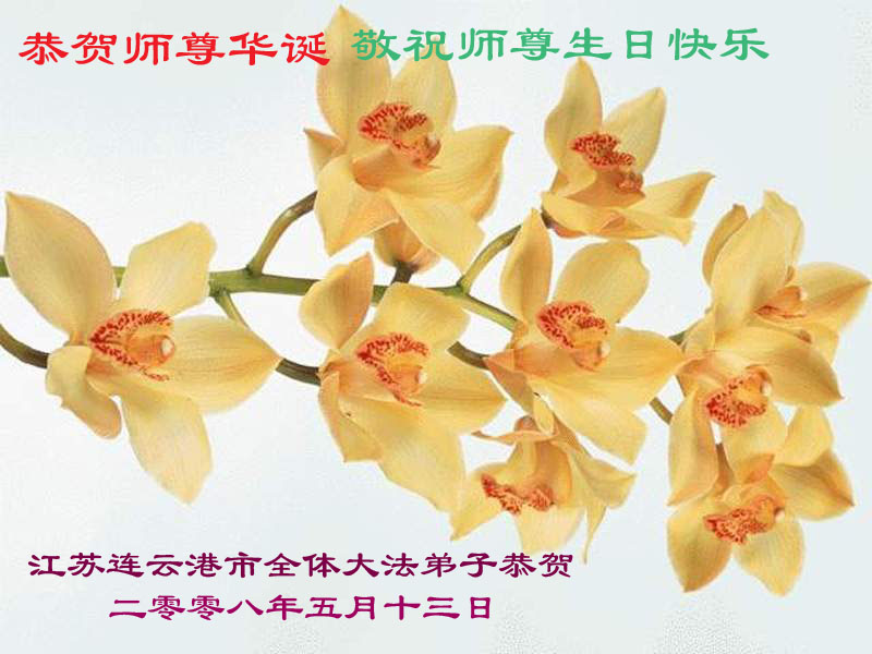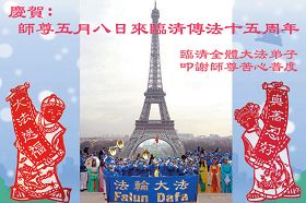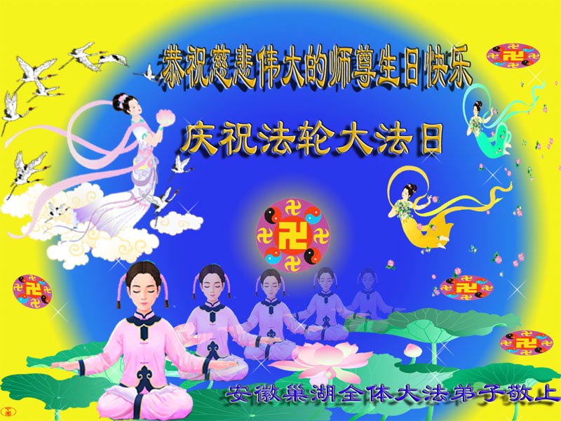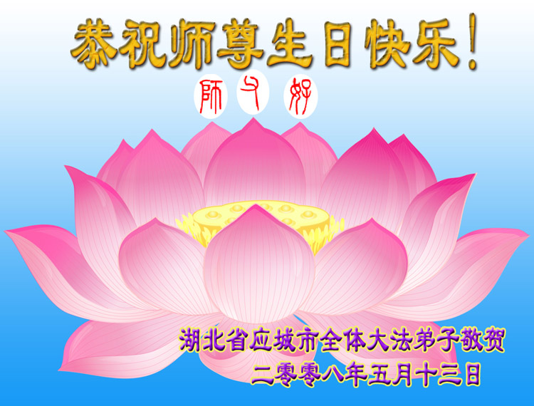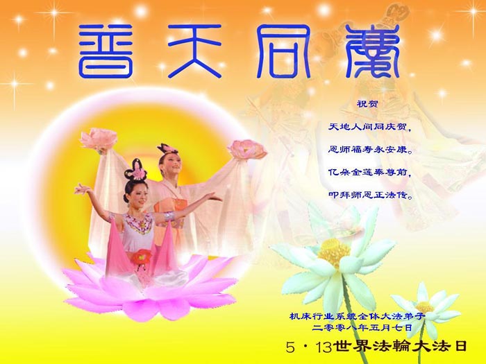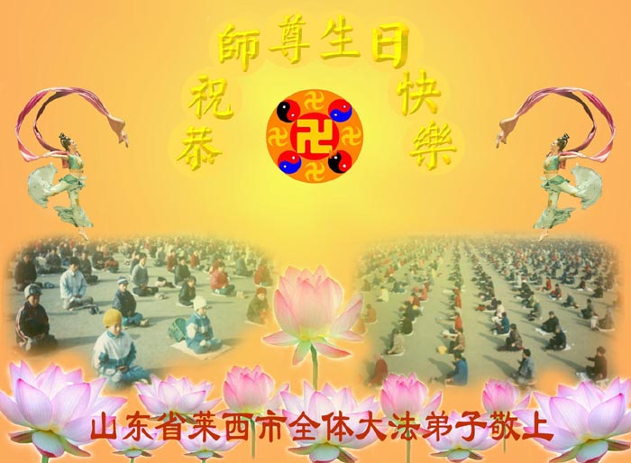 祝贺法轮大法洪传十六周年!祝贺第九届世界法轮大法日!在这双喜的日子里,首先恭祝慈悲伟大的师尊生日快乐!祝全世界大法弟子节日快乐!在此感谢师尊的慈悲苦度,我们盘锦大法弟子一定谨遵师诲,做好三件事,敬请师尊放心。愿全世界大法弟子共同精進!