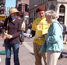 ![]() 法轮功学员讲真相时征集「反迫害」签名。 |