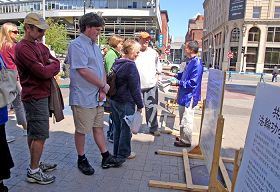 在这普天同庆的节日,为了让可贵的中国人能了解大法的真相,波士顿学员特意在华埠举行庆典。加以正逢母亲节,又靠近华埠牌坊入口处,来往行人驻足观赏,异常热闹。