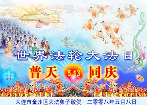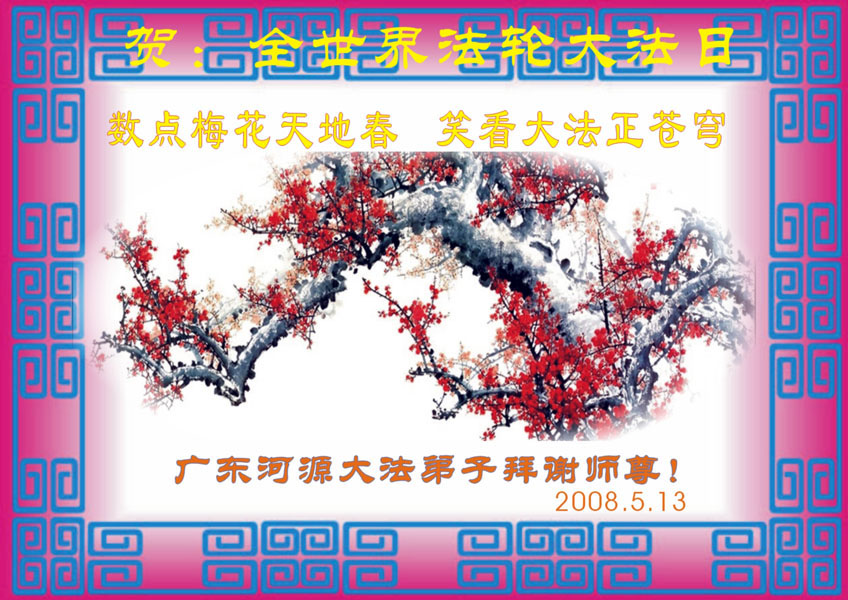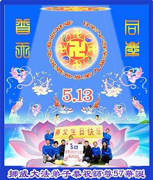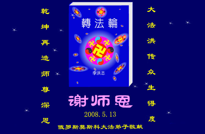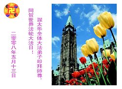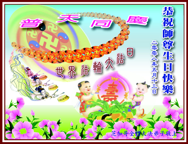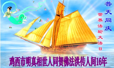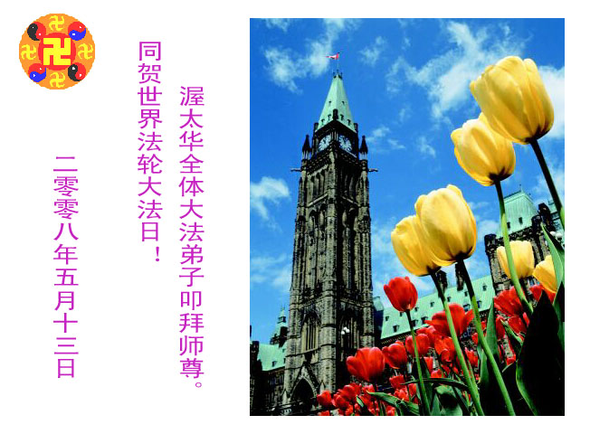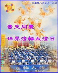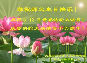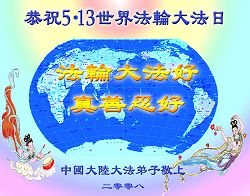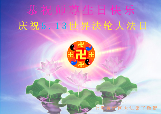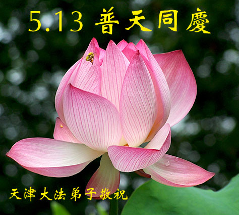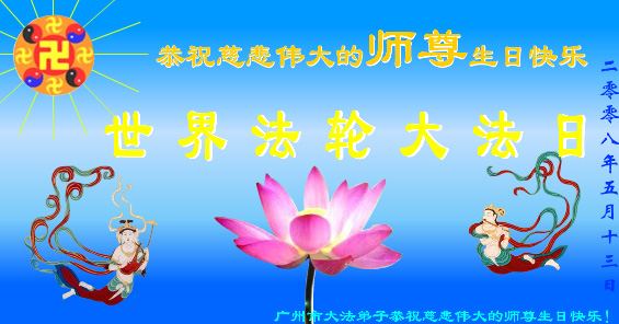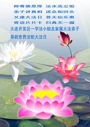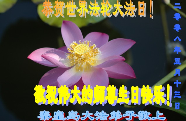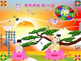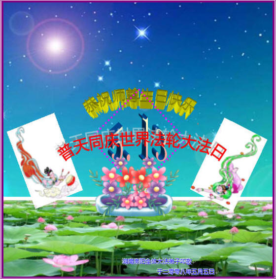 又一个世界法轮大法日到了,我们怀着无比激动的心情迎来了这个令人尊敬的日子:世界法轮大法日:5.13.我们无法用特别的词汇和语言来表达我们对大法的崇敬和对世界法轮大法日的敬意,我们能做的就是用我们的最大慈悲去救度哪些被谎言毒害的众生,完成我们的史前大愿。让我们用两句真言结束我们的贺词:法轮大法好!真善忍好!