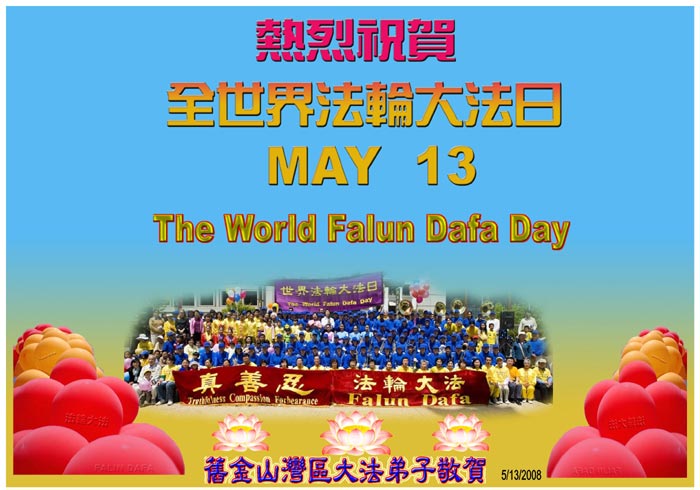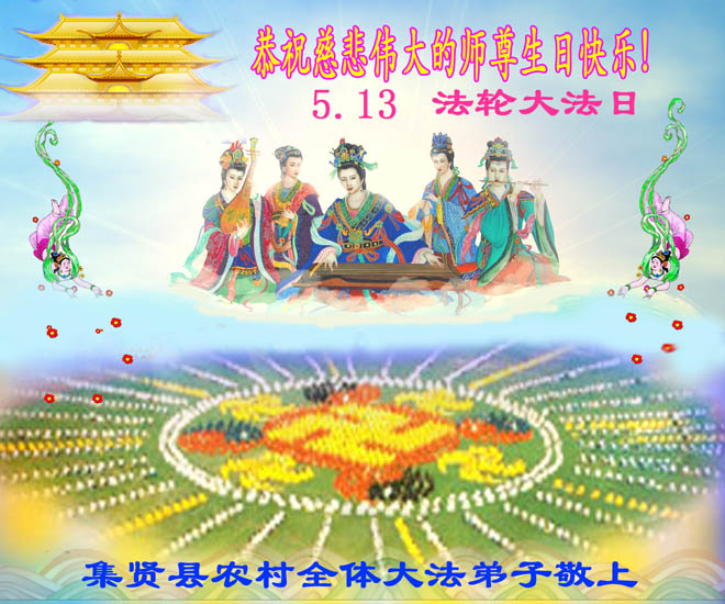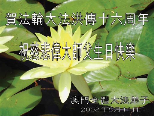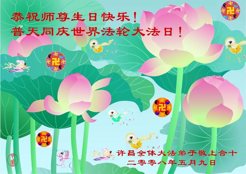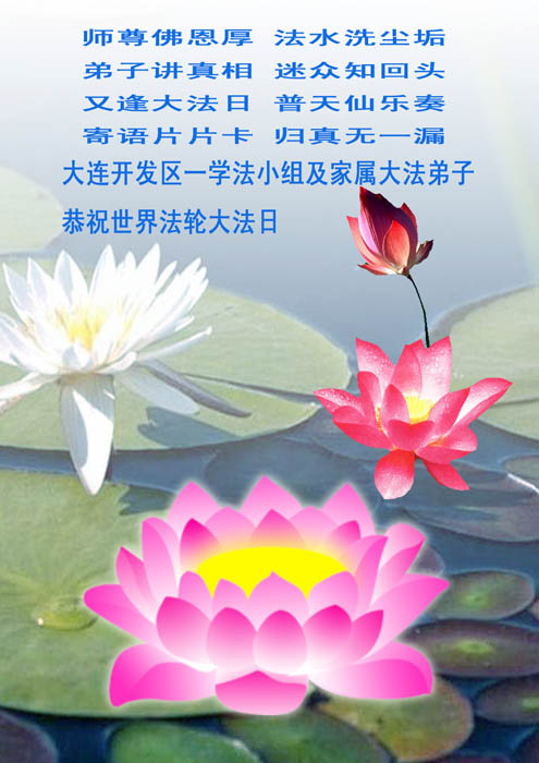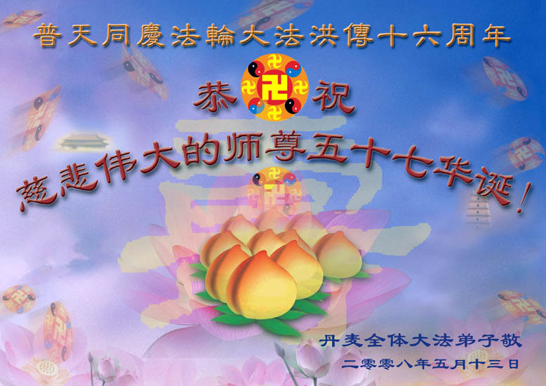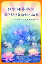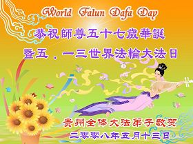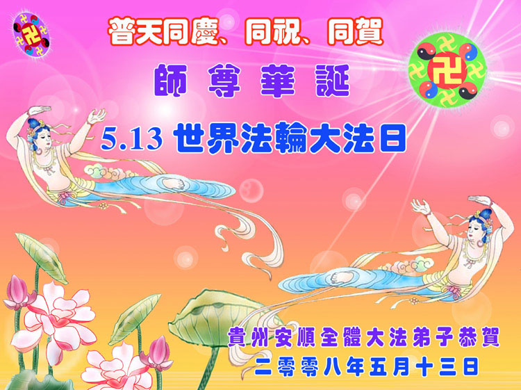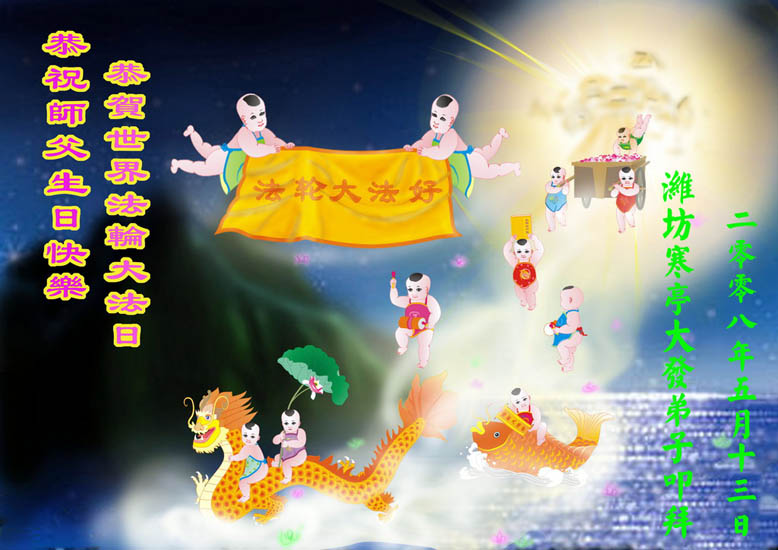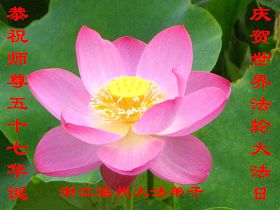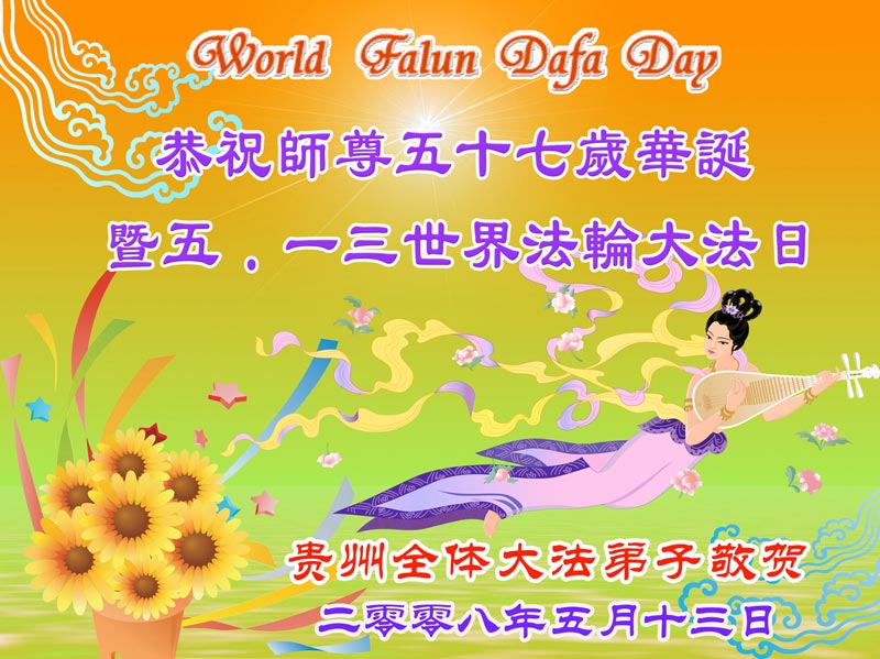 又一个世界法轮大法日到了,我们怀着无比激动的心情迎来了这个令人尊敬的日子:世界法轮大法日:5.13.我们无法用特别的词汇和语言来表达我们对大法的崇敬和对世界法轮大法日的敬意,我们能做的就是用我们的最大慈悲去救度哪些被谎言毒害的众生,完成我们的史前大愿。让我们用两句真言结束我们的贺词:法轮大法好!真善忍好!