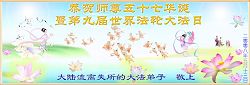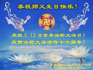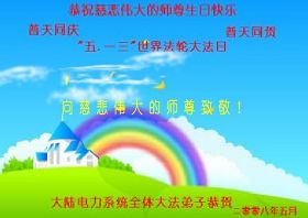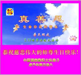 过几日就是世界法轮大法日了,我代表所有在大陆的大法弟子教师祝愿尊敬的师父好,全世界的大法弟子好,祝愿法轮大法的美好一定带给世界的每一个角落。我一定不会辜负师父的慈悲苦度,在以后的时间里我一定要做好三件事。