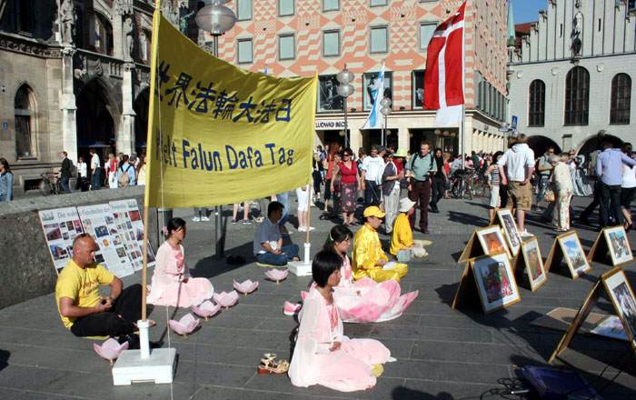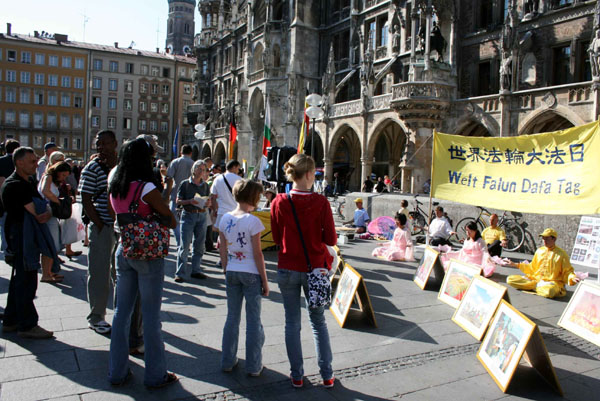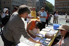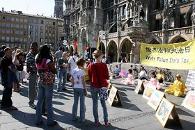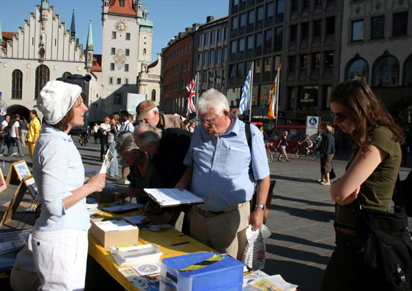 玛琳广场位于慕尼黑闹市区,风和日丽的五月,玛琳广场人山人海,不少人被法轮功优美的音乐和动作所吸引,他们认真观看展现法轮大法洪传世界、中共恶党迫害法轮功等真相图片展。很多人了解真相之后,纷纷签名支持制止迫害。广场上还有很多中国大陆来的游人,他们中有的人拍照留影、有的人接过法轮功真相资料和九评,还有的人当场表示退出中共的组织。
