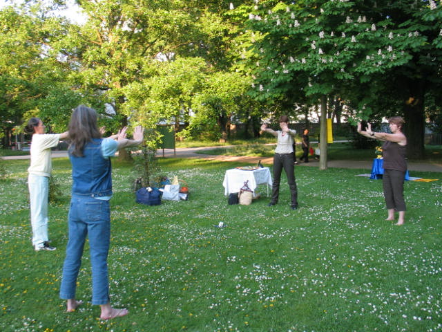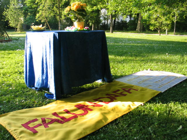 【明慧网二零零八年五月十五日】二零零八年五月十三日晚,在瑞士第三大城市巴塞尔的市中心公园,法轮功学员欢庆世界法轮大法日。