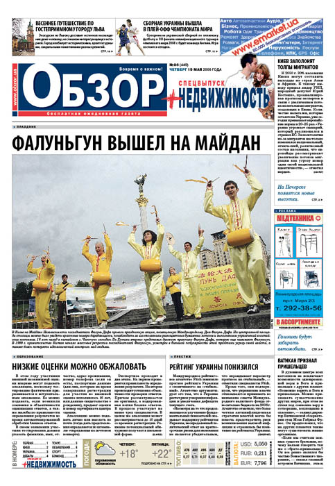 报导说:法轮功修炼者在基辅市中心广场举行活动,庆祝世界法轮大法日,在广场上人们可以看到身穿中国服装的打腰鼓之人,不同颜色的纸莲花和功法演示。
