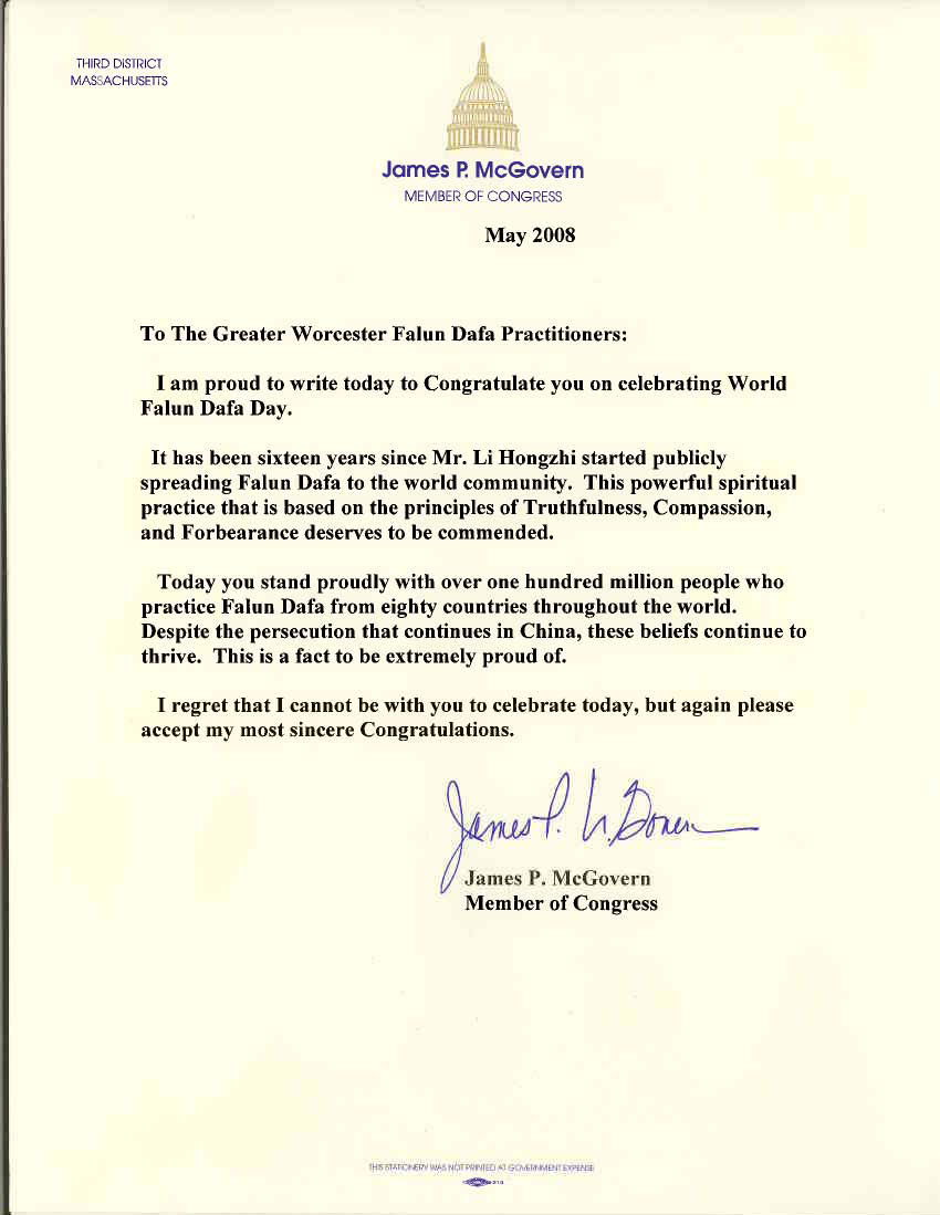 我今天很自豪的致信祝贺你们庆祝世界法轮大法日。自从李洪志先生在世界各地公开传播法轮大法以来,已经过去了十六年。这一基于“真、善、忍”原则的富有威力的精神修炼值得表彰。