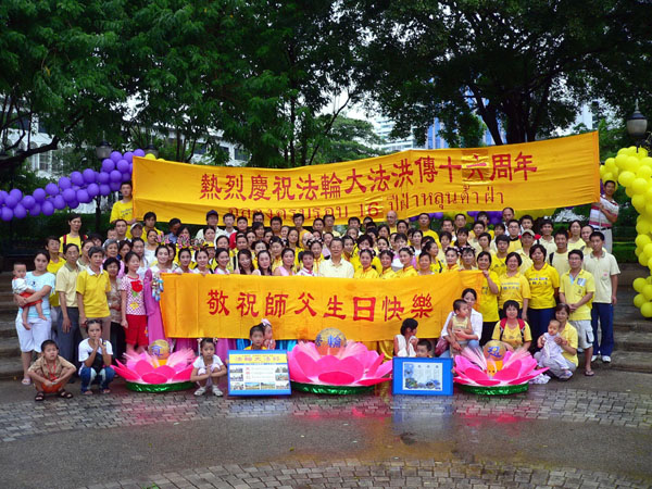 五月十三日下午,泰国法轮功学员准备了丰富的节目,带着彩色气球、腰鼓、横幅等来到皇后公园,欢庆世界法轮大法日,并向法轮功创始人李洪志先生祝寿,表达对师尊的感谢,歌颂大法的恩德。从中国辗转来到泰国的大陆法轮功学员,也在此欢聚一堂,表达对师父的感恩和心声。