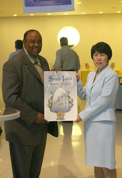 ![]() 圣路易斯市议员塞廖尔•摩尔为神韵艺术团送来市议会的褒奖 |
