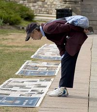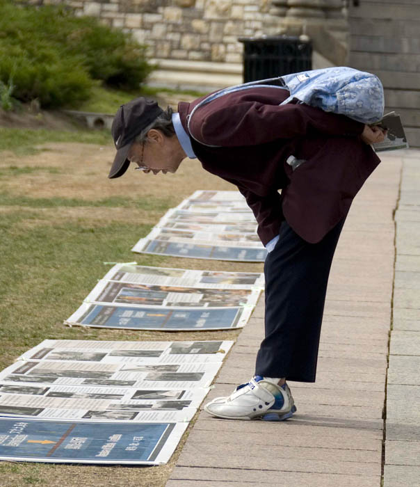 法轮功学员还通过真相图片展、资料等向游客们介绍法轮大法(又称法轮功),以及法轮功学员在中国遭受的迫害。