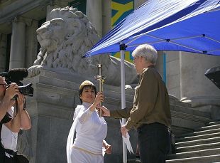 二零零八年五月二十五日,由法轮功受迫害真相联合调查团发起的人权圣火全球巡回传递活动抵达加拿大温哥华站,国会议员、国际著名人权律师、社会名流、前加拿大小姐及非政府组织代表等参加了集会及会后的圣火传递步行。