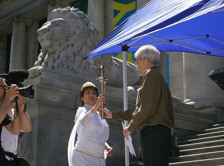 ![]() 加拿大国会议员Bill Siksay接过人权圣火火炬(摄影:肖骊) |