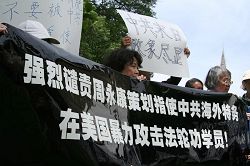 二零零八年五月二十八日下午,美国大华府地区部份法轮功学员在中共驻美国大使馆前举行新闻发布会,强烈谴责周永康利用中共在海外的特务机构,煽动仇恨,进行肇事,攻击退党中心义工。