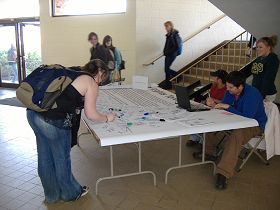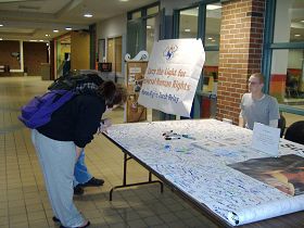 在三天的活动里,征集签名活动从每天早上八点开始,进行到下午六点。最后一天在学校的星巴克咖啡店外进行到晚上九点。“您愿意在横幅上签名,呼吁停止在中国发生的迫害人权之暴行吗?”学生们一遍一遍的喊着。