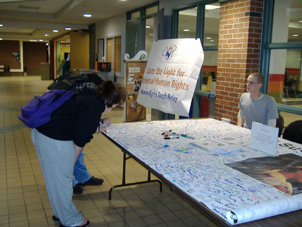 为了迎接二零零八年五月十日,来到密西根州底特律的人权圣火,有一群北密西根大学的学生自愿帮忙在校园举行了征集签名活动。这群热心善良的学生们利用课余时间帮忙征集签名。有的说:“我车上有粉笔,我们应该让更多人知道。”于是自愿者们在教学大楼外的水泥地上用粉笔写上了大大的字:“Stop Human Rights Violations in China!Come in and Sign the Banner!(制止在中国发生的迫害人权之暴行!请进来在横幅上签名!)”