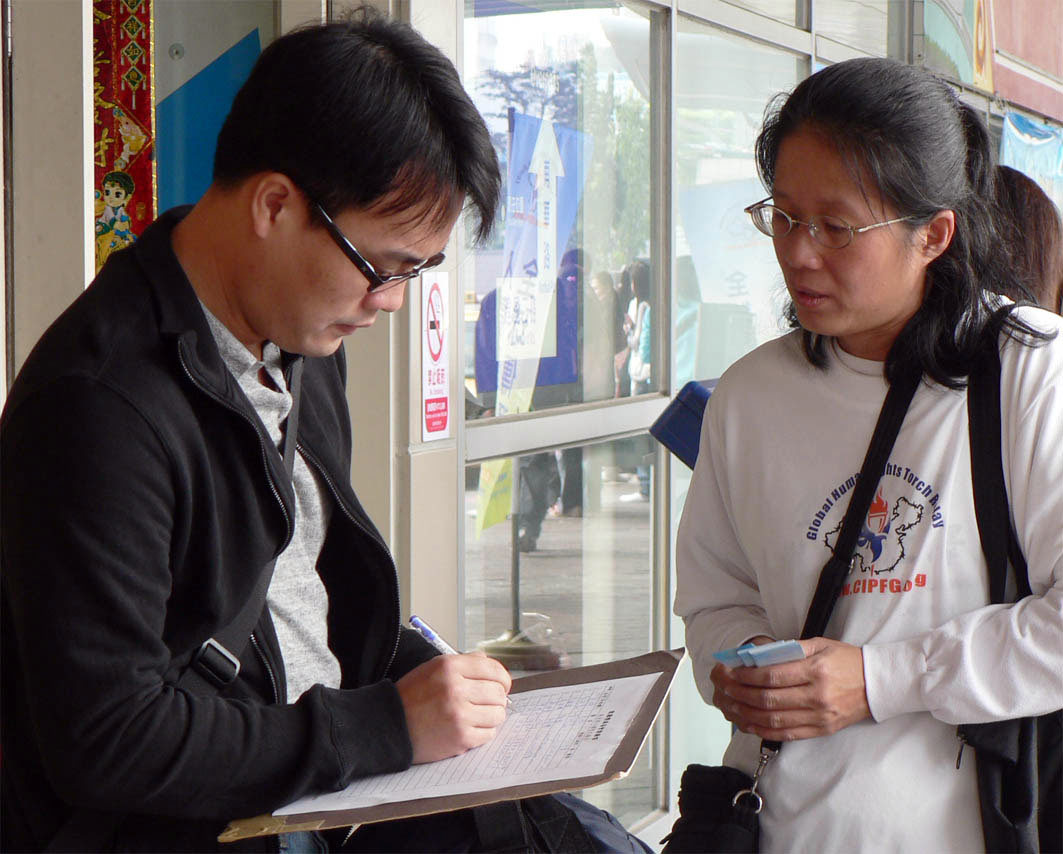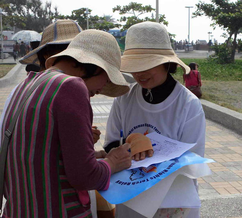 真相联合调查团亚洲分团(CIPFG Asia),为迎接二零零八年六月「人权圣火」来台,于去年十二月在全台湾十三个县市同步举行「守护人权、全民响应」活动之后,在台湾全省各地展开百万征签活动,高雄地区民众亦不落人后,在明白大陆法轮功学员受迫害情形后,热烈回响签名支持反迫害,并呼吁制止中共迫害法轮功。