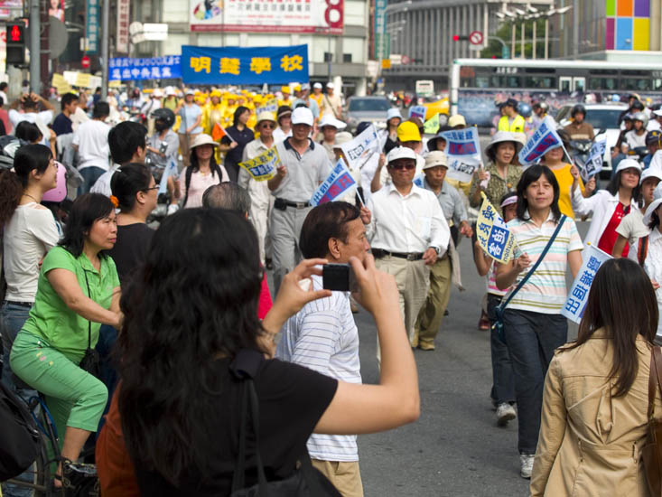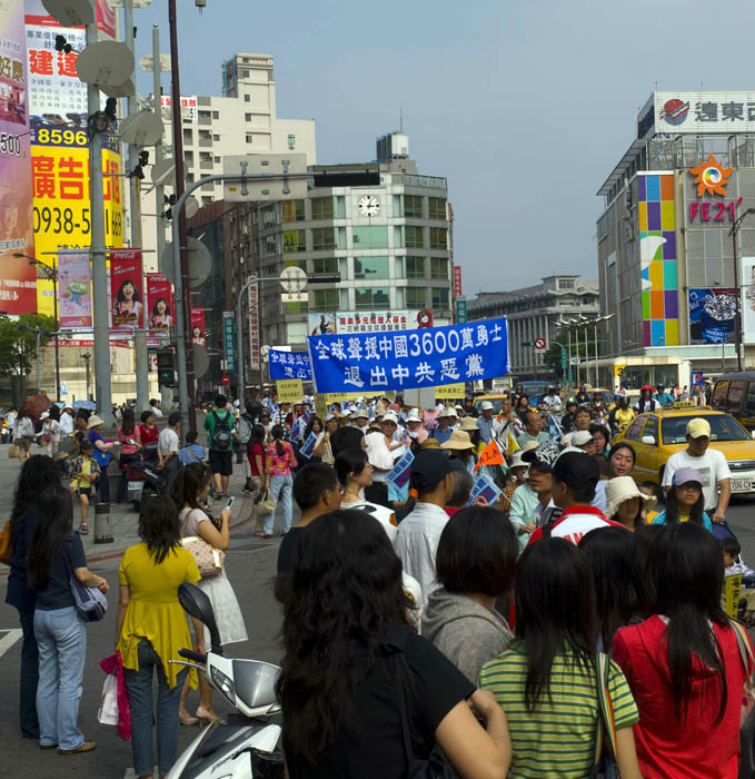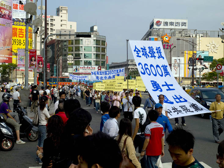 ![]() 台湾民众拿着展板,举着横幅,扶老携幼走上街头,一起声援三千六百万名退出中共邪党的中国人,沿途获得热烈的共鸣 |