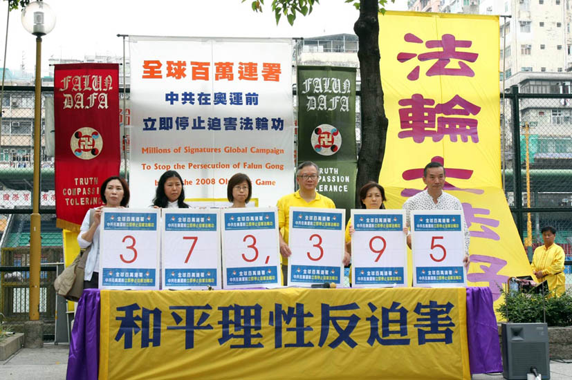 ![]() 香港法轮功学员在五月一日的反迫害集会上公布最新联署数字。 |